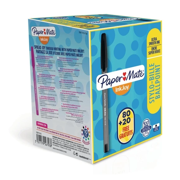 Paper Mate® InkJoyTM is a revolutionary ink system that starts quickly without dragging, requires minimal pressure from your hand and delivers crisp, clean lines every time. Triangular shape for comfort and control. Transparent colour-tinted body for a refreshing look. Medium 1.0mm tip. Black ink. Pack of 80 plus 20 FREE!