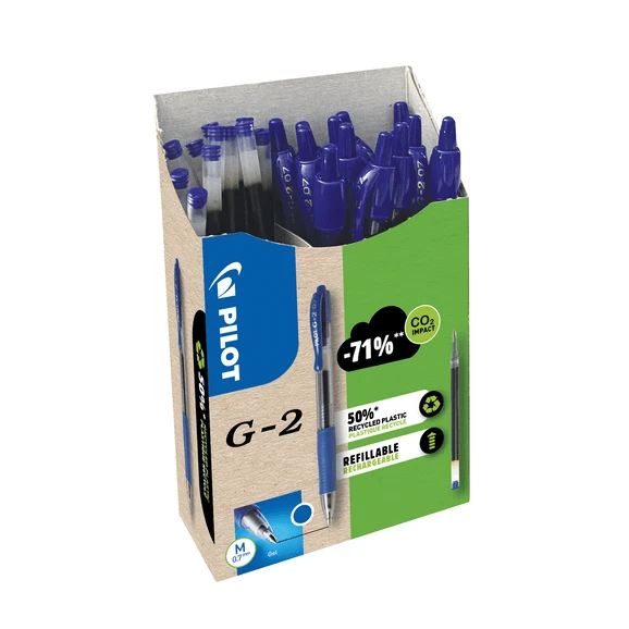 If you are looking for a pen which helps limit impact on the environment, the Pilot G2 is a great choice. The Black and Blue ink colour versions are made using a minimum of 70% recycled plastic and are also refillable. These features not only help reduce plastic consumption and waste but also the CO2 impact as using one pen produced with recycled plastic and refilling it three times reduces the associated CO2 by -71%, compared to using 4 pens which contain no recycled plastic.