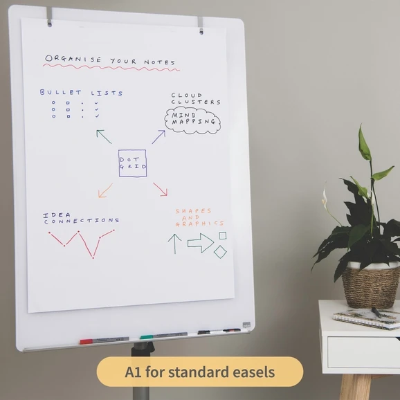 Big and spacious, this great quality A1 20mm dot grid flip chart pad is the perfect canvas to assist you during meetings, brainstorming sessions and to encourage teamwork and discussion in class, online or in person. The 30 perforated sheets of sustainably sourced and PEFC certified 80gsm dotted paper provide plenty of space and flexibility. Use the dots to create flow charts, graphs, mind maps, bulleted lists or to map out business plans and projects. And when you’ve filled the sheet, simply flip it over and start from scratch or tear off and store your work.